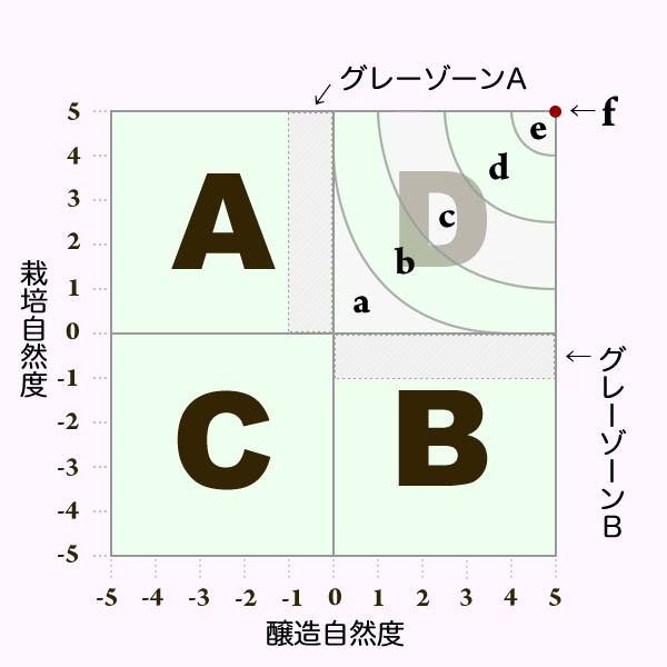 A ブドウ栽培はビオ、ビオディナミ栽培をして創意工夫・努力しているが、美味しいワインを造ろうという意志が見当たらない。自然な栽培をすることで満足しているタイプ。収穫量を多くとってしまったり、醸造途中で補糖したり、香り付人工酵母を使用したり、酸化防止剤を必要以上に使用したりするタイプ。ビオワインの見本市へ行くと、不味いワインが沢山あるのに驚く。 CPVとしては、ビオ・ワインである事がイコール自然派ワインではないことを強調しておきたく、このカテゴリーは自然派から外したが、ブドウの潜在能力は概して高いので実に勿体ない。 最近、ビオを名乗ると売れやすいので、ビオに転換する醸造元が増えているのだが、このタイプが急増しているのは残念なところ。 ただ、地球環境を考える時、少しでも多くの畑がビオになることは喜ばしいことである。理由の如何を問わずリスクの多いビオ栽培をする決断と努力に対しては強く評価したい。でも、ワインは美味しく造ってほしい。 B 栽培上は除草剤、殺虫剤、化学肥料などを使用しているにも関わらず、 醸造では自然派を名乗って酸化防止剤の使用を控えたりするものの、栽培される土壌が弱っているために酵母菌も居なくなるので発酵もされず、結局はテクニックに頼らざるを得なくなってしまう偽自然派になってしまいます。 土台や柱がいい加減な耐震性のない建物と同じで、最近はAと同じくこのタイプも急増しています。 最近の大手有名どころのワイナリーが日本でセミナーをやると、ほとんどのところが自分は自然派であるかのように云うのには驚きである。 すべては畑を見れば一目瞭然である。CPVの推薦する醸造元は必ず我々が実際に畑をみて醸造所もみて現場をみて判断している。 C 栽培上も除草剤、殺虫剤、化学肥料、なんでもござれ、土壌に微生物など皆無の状態。こんな状態の畑からとれたブドウはエネルギーがないので、いろんな醸造テクニックを駆使して化粧する必要がある。ブドウジュースを濃縮したり、酸を足したり、補糖したり、人工酵母を使用したり、テクニックで化粧されたワイン。栽培も醸造も工業的な画一化されたワイン。ただ自然派という観点から外れれば、常に(毎年)同じ味、収穫量は確保出来るという点を評価する人たちもいる。 D 栽培はビオ、ビオディナミ、または公式機関に登録してなくても自然な栽培をしていること。、最重要なことは土壌が生きているということ。 公式ビオ機関の公認を受けている否かは重要なことではない。公認は一つの目安にはなるけど自然派の条件には入らない。 CPVの認める自然派は我々が自分の目で畑を確かめたものに限る。これらカテゴリーはそれにあたる。 ワインは畑で造られると云っても過言ではないほど、CPVでは栽培、農作業を重要視している。健全な土壌に育ったブドウの木は、根が真っすぐ地中深く伸びて土壌のミネラルが詰まった健全なブドウが収穫される。そのように健全なブドウを原料として醸造すると、人工酵母を添加しなくても、酸化防止剤の使用を極力控えても、素晴らしいワインが出来る。 醸造元がよく云う、『私は美味しいワインを造ることが目標であり、その為には美味しい健全な葡萄が必要であり、その為には土壌を生かすビオ的な栽培が必要であった。勿論、一本の木からとれる収穫量を少なくして濃縮した葡萄をつくり、醸造上も極力ワインに圧力がかかるようなポンプなども使用せず,土壌から得た純粋な葡萄の旨味を最大限に表現したワイン』 これが自然派ワインである。 このCPVが提唱する自然派ワイン(D)をタイプによって分類すると、以下のようになる。 e: 超自然派 f点の孤高の超自然派を頂点にeは自然派中の自然派。ピュアな葡萄の果実味が全面にでて、土壌からくるミネラルでしっかり支えられているタイプ。 (フィリップ・パカレやマルセル・ラピエール、マルセル・リショ、ダール・エ・リボなど) 栽培も醸造も自然度が満点に近いもの。 d-e : 独創派 その造り手の個性が全面にでている個性的なワイン、この人間しかこんなワインができないという強烈な特徴、独特な風味をもったワイン。 (ゴビーとか、ポール・ルイ・ウジェーンヌ、レグリエール、マーク・ペノのようなワイン) 自然度はかなり高い方。 c-d : 風土派 造り手の個性はそれほどワインに出ておらず、そこの土壌や風土、人などが調和がとれてワインに表現されているもの。 果実味が強く、ミネラル感も濃縮度も中庸で比較的気軽にスイスイ飲めるタイプ。 (エステザルグのワインとかラトゥール・ボワゼなど) b-d : 正統派 栽培や醸造も自然であり、熟成の仕方が樽を使用して比較的、樽香がワインに残るタイプのワイン。自然派ファンの中には樽を必要以上に嫌う人がいる。しかし栽培も醸造も自然にやっていれば立派な自然派だ。樽風味は好みの問題である。ボルドーの自然派に多いタイプ。 (シャトー・ド・プイ、シャトー・メレ、シャトー