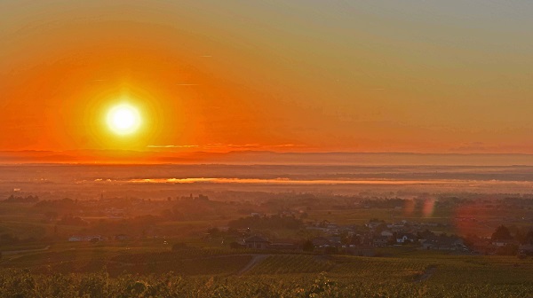 デコンブ醸造のあるモルゴン村の高台に朝日が昇る。 収穫はam 7:00に蔵を出発して収穫する畑に向かう。 その途中で見える朝日はとても美しい! 朝日が昇る方角にはモンブランなどアルプスが遠く見える。 途中、あのミティークな丘、コート・デュ・ピにも朝日が当たりだした瞬間。