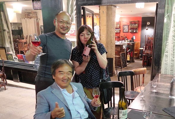 夏時間になったフランス、夜遅くまで明るい。 このままでは終われない。 レプブリック広場の近所からブルスまでタクシーを飛ばした。 二次会にCoinstot Vinoコワンスト・ヴィノへ コワンスト・ヴィノではワイン愛好家のJun Sakanoさんに逢う。 Junさんは東京世田谷区のワイン屋ESPOA ナカモトのお客さんでワイン会にて何度かお逢いしている。 なんと、偶然にもパリで逢うとは凄い確率。 これはめでたい。一緒一杯楽しまなければ、てなわけでトビッキリ美味しいワインを開けました。 迷わず L’Anglore ラングロールの Vintage2015 を開けた。 イヤー、美味しい!!なんという液体だ! J’adore L‘Anglore!! 話しも弾んで、もう少し飲みたい。 2本目に、これまたトビッキリ美味しい、ジュラ地方のユグ・ベゲの Hughes Beguet のプルサールを開けた。 なんて、美味しいんだろう!   10年ぶりにフランスに来た萬谷シェフとホントに楽しいひと時を過ごしました。 明日から久々の萬谷さんとの道中を楽しむとしよう。
