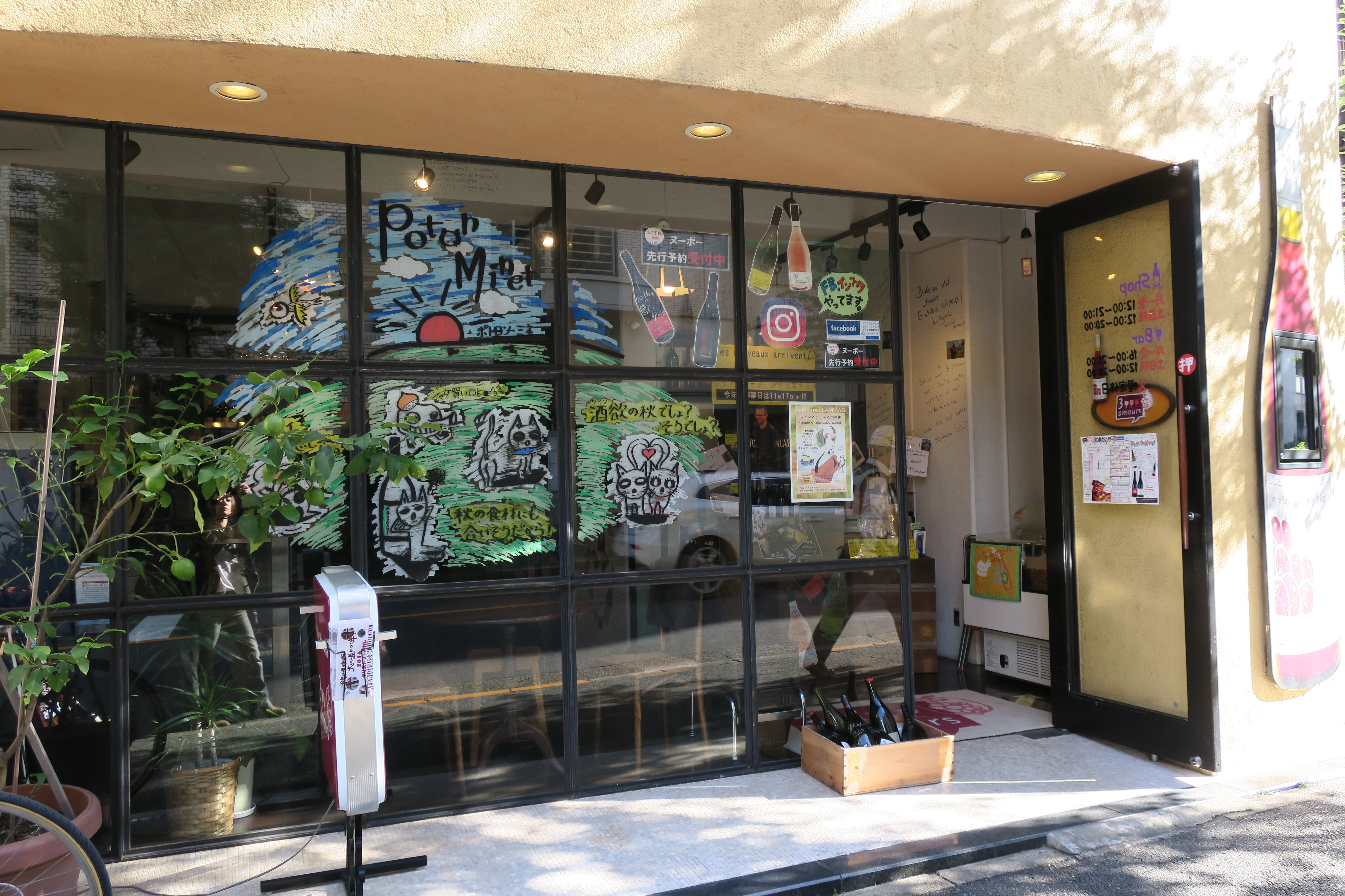 やってきました、恵比寿にあるワインショップ、Les 3 Amours *レ・トロワ・ザムール!! ワインインポートやワインコサルティングをやっているBMO様のワインショップ及びワインバー!! マルチな面で活躍する方たちです。 Les 3 Amours とは3つの愛、ワインを造る人・伝える人・飲む人の3つの愛を込めて名づけられました。 お店の回転が速い恵比寿の中でも10年続いているこの場所はまさに伝統的!! ワインのセレクションは勿論ですが、とにかくウィンドウのデッサンやお店の中のレイアウトが凄い! 生産者たちのメッセージや写真、スタッフのコメント、本当に活気的でアットホームな雰囲気です! ウエタサン、ネギさんそしてセイトさんのフレンドリーな笑顔にお客さんも癒されている様子。 今はルシヨンでワインを造っている Domaine Potron Minet*ドメーヌ・ポトロン・ミネのワインフェアや、もうすぐ解禁となる南のヌーボー(アルノー・ヌーヴォー)、勿論ボジョレーヌーボーのフェアの真っ最中! エントランスには、上品でスーッと飲みやすいガメイ品種を醸造するChristophe Pacalet*クリストフ・パカレのポスターとメッセージがドーンと! 楽しいお店ですので恵比寿に寄ったら是非遊びに行ってください!