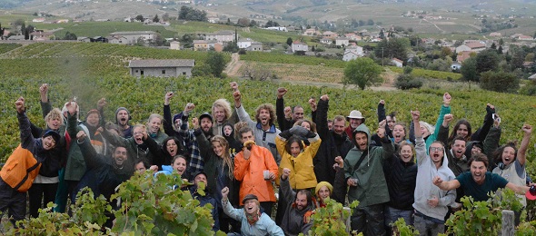 自然派ワインの源流Lapierreラピエール家の収穫・ボジョレ 収穫が始まって一週間程すぎた頃、収穫人の疲れが溜まってきた頃、さらなる結束とエネルギーの補給にアペロを皆で楽しむ。 今年は25か国の若者、フランス、オランダ、アメリカ、カナダ、ブラジル、東欧諸国、日本、など世界中の人達が集まって収穫している。 一週間も朝、昼、晩と寝食を共にしていると、お互いがもう分かっている。 中には、もう15年連続で参加している人もいる。 ニューヨークの有名レストランの女性ソムリエールも来ていた。 必ず楽器を演奏する人達が混じっていて、夜の食事の後は演奏会になる。 相変わらず元気なマリー(故マルセル・ラピエールの奥さん)、雰囲気を盛り上げる。 このマリーさんも若き頃、収穫人として北フランスのメッツからやって来た。 その時にマルセルと巡り逢った。依頼ずーっとモルゴンにいて、マチュが生まれ、また次世代も生まれている。 また、そんな中に混じって、超プロ集団のチームもいる。 20名分の収穫量をたったの5人でやってしまうプロ集団がいる。 早いだけでなく、良い葡萄と中庸の葡萄を仕分けしながらキッチリと進んでいく。 私も彼らと一緒に収穫したことがある。 物凄いスピードで確実に進んでいく。 私の6年間、ポムロルで収穫した経験もあり、スピードでは自信があったけど、単なるアマチアであったことを思い知らされた経験がある。 マチュも大切な区画は彼らに任せている。 そんな、プロ、アマ、音楽家、若い人、チョット年を過ぎた人、が混ざって一同に集まって、収穫するのがラピエール家の伝統だ。 このボジョレの収穫文化は無形文化財と云える。 今は、少しづつ消えていっている。 収穫は単に機械的に葡萄を穫るのみにあらず。 フランスの深いところにある文化そのもの。異質文化交流の原型だ。 この喜び、歓喜、交流のDNAがワインに入っていくのは当然のこと。 ラピエールのワインには、特別なエモーションが流れている。 元気つけたいとき時、勇気がチョット欲しい時、嬉しい時、是非、一本開けてください。 大切なものが動き出します。
