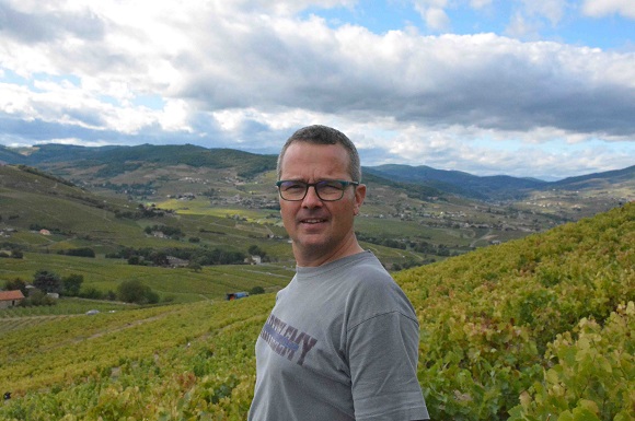BY:TAKESHITA 今回クリストフはアムステルダム試飲会の為不在で主役はクリストフの右腕ドゥニ・ペノさん! ご存知、ミュスカデの鉄人マルク・ペノの弟。   20代の時ロブションでソムリエ経験を持つ芸術家で、30年前マルセル・ラピエールとの出会いが、 彼をロワールからボジョレーに惹きつけた。 マルセルに飲ませてもらったモルゴン1984年でガメイの魅力に取り憑かれたらしい。 現在60歳だが、エネルギー漲るドゥニ。 これからのクリストフとの新しいプロジェクトを熱く語ってくれた。   さて今年は開花はコート・ド・ブルイィは6月上旬、フルーリーはちょうど今開花終わったところ。 雨が多く、最近気温も上がってきたのでベト病の恐れがあったが、今年は風が強く、ぶどうの湿気を 飛ばしてくれて、ぶどうは健全に育っている。 2018年収穫は、ヌーヴォーで8月末、ヴィラージュで9月上旬くらいとのこと。 3週間前に瓶詰めしたばかりの2017年キュヴェを試飲したが、2017年はサンタムールと コート・ド・ブルイィ以外の区画は雹害にあった。 最終的に2015年のような熟度のぶどうが収穫できたが、まさに選果のヴィンテージ。 また雹害にあった区画は例年よりマセラシオン期間を短くしている。 また熟度が高くアルコール感とのバランスを取る為、ガスを残したまま瓶詰めしている。 ボジョレー・ヴィラージュはグァバのような果実味と酸。グイグイ行ける。 サンタムールはパッションフルーツのような心地よい酸がありエレガント。 シルーブルはしっかりとしたミネラル感。 コート・ド・ブルイィは金柑のような酸が気品を感じさせる。 ムーラン・ナ・ヴァンはしっかりとした骨格のまさにグラン・ヴァン。 ボジョレーの多様なクリュの個性を表現するクリストフ。2017年ヴィンテージ好きだな(^^)。