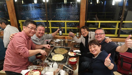 屋形船に乗って東京湾へ。 世界ソムリエール・コンクール5位、高級リゾートホテル・総料理長の梶川さんこと梶さん。 飛っきり美味しいヌーヴォーを醸すクリスト・パカレ。 毎日日本中を駆け回っているBMO社、Masakoさん。 クラブ・パッション・ド・ヴァンのMasaki. そして、私。   愉快なメンバーと屋形船に乗り込んだ。 大江戸の夜景が動き出した。 総料理長の梶さんが焼いてくれるもんじ焼、お好み焼き、焼きそば。 クリストが自分のヌーヴォーを開ける。 ジワジワと焼けてくるお好み焼きにクリストフ・ヌーヴォーを合わせる。      日常あまり逢えない“志”の共通な仲間とやるこんなひと時は人生上の特別な一幕。有難う梶さん! 屋形船で東京の日常を離れて、夜景になった雑踏を眺めながらヌーヴォーを楽しむのもいいもですよ!!