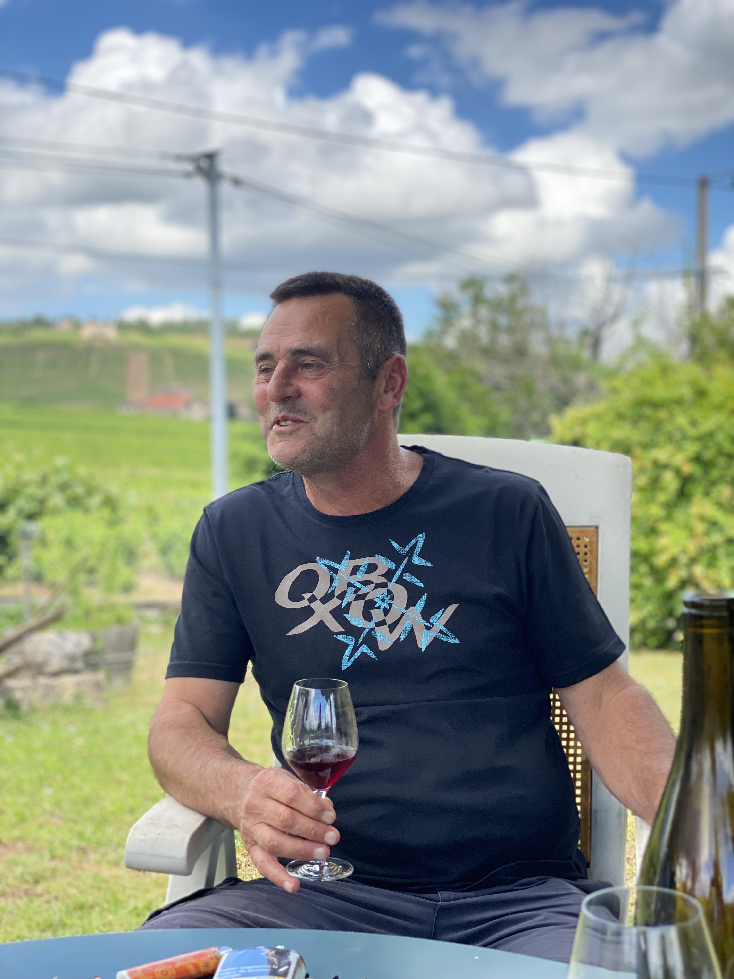 22回目の収穫のクリストフ・パカレにとって、今までに経験したことがない厳しい自然環境での葡萄栽培だった。 4月の寒波はマイナス6度という異例な気温だった。温かかった暖冬で芽がいつもより早く出ていた。 それが3日間も続いた。 多くの芽が凍ってしまった。 その後、5,6月と曇り空が続き、さらに7,8月と気温が上がる中、雨が降り、さらに曇り天候で湿気が多かった。 ウドンコ病を筆頭に、色々な病気が発生した。 まるで、葡萄栽培上の“トラブル”のオンパレードと云ってもいいほどだった。 . 天が与えてくれた試練をすべて受け容れて、できうるすべてを尽くして対応したクリストフ。 その仕事の総決算が、今日の収穫となった。 . 傷んだ葡萄も存在するけど、自分がすべてを尽くした結果の葡萄を手に、笑顔のクリストフがそこに居た。 . 厳しい葡萄栽培で、無理をしたクリストフ、膝を痛めてビッコをひいていた。 (医者からは安静にしているように、との指示も出ているけどそれもならず) この忙しい時期に、思うように動けないジレンマも受け容れているクリストフだった。 . 自分で動きたい動作も人に頼まないとできない状況の中、モクモクと仕事をこなしていた。 . クリストフ 『今年もこの天が与えてくれたこの葡萄で、日本の皆さんに喜んでもらえるワインを造ってみせるよ! 今年こそ、ガメーのヌーヴォーらしい、軽快でスイスイ体に入っていく典型的なスタイルになりそうだよ!』 . 一段と“人間”が大きくなったクリストフがそこにいた。 . そんなクリストフが造る2021年のワイン、エモーショナルな美味しいワインになりそうだ! 朝日を体全体に享けてエネルギーを吸収しているクリストフ・パカレ マジックな今年の収穫、この太陽の真正面にお月さんが、この収穫を見守っている。 収穫チームは、まだ暗い太陽が上がる前に葡萄園に到着。 太陽が昇ると同時に明るくなって収穫を開始する。 私も朝起きて、ホテルを出る時は真っ暗。葡萄園に着く頃に薄明るくなる。 太陽とお月さんがにらめっこするように大局に出ている。 シーンと静かで薄暗い葡萄園に幻想的な世界が広がっている。 葡萄を切るハサミの音がチャキチャキと響いている。 屈強の収穫人とソフトな収穫人を集めたクリストフ・パカレ 今年は、天候不良による傷んだ葡萄が多くある。 よって、今年の収穫は“選別作業”が超重要な仕事になる。 ただ、葡萄を切り取れば良いわけではない。 葡萄房の中でも、傷んだ部分を切り落とす細かな注意を必要とする作業が大切。 マルセル・ラピエールから教わった自然ワインの造りの最も大切な事に一つは、健全な葡萄のみを発酵槽に入れること。 酸化防止剤を使用しないで、自然酵母だけで発酵する為は、雑菌が入ることを避けるのが超重要! だから、クルストフは、この作業を徹底してやるように指導している。 収穫のスピードは極端に遅くなる。 なぜなら、腰を下した状態でカットした葡萄を立って綿密に悪い部分を切り落とさなけれならない。 つまり、スクワット運動を繰り返しながらの作業になる。非常につらい仕事である。 今年の最高にいい天からの贈り物は、収穫時の温度が低いこと! 今日の朝は何と7度Cだった。雑菌が繁殖しにくい状態を確保できる。これは自然な造りには超大切なこと。 作業を始める朝は、寒いので防寒服を着ている。 そして、こんな時はムードを盛り上げてくれる元気者も大切。 いいメンバーに囲まれて、美味しいワインを造る為の収穫が着々と進んでいる。
