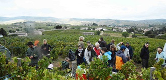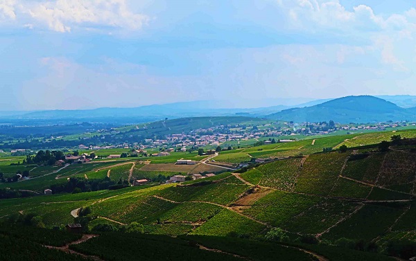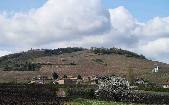真ん中にある村が Villié-Morgon ヴィリエ・モルゴン村、 その裏にある小高い丘がモルゴンの銘醸畑 Côte de Py コート・ド・ピィ。 今はなだらかな丘になっているけど、その昔は火山だった。 それが風化して今のなだらかな丘になっている。 何億年もかけて今の土壌構成が造りあげられて、私達に美味しいワインをプレゼントしてくれる。 右斜め後ろにあるのが Côte de Brouilly コート・ド・ブルイィ。 ここにも3億年の歳月をかけて構成されたシスト土壌と花崗岩の混ざった特別なテロワールがある。 更にその昔、ここも含めてフランス中が何回も海に覆われていた時期もある。 そんな歴史を経てこの景色がある! 感無量になる。