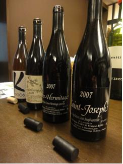 まだ、“自然派”なんて言葉が存在するズッと以前、1980年代初頭から自然な手法でワインを造り、多くのワインファンをつくってきたルネ・ジャンが、今年も日本にやってきた! どうしてルネ・ジャンは自然なワイン造りをするようになったのだろうか? 理由は簡単!お父さんが造っていたワインを日頃飲んでいて、自分もそのようなワインを造りたいと思ったからだ。しかし、若くしてお父さんを亡くしてしまったルネ・ジャンは、父から造りを教わったというよりは、お父さんと同年代、或いは昔ながらのワインを造るお爺さんの造り手の話を聞きながら自分なりに会得していったのだった。 そのルネ・ジャンが今年も日本にやってきた!フランスでも根強い『ダール・エ・リボ』ファンが沢山いるが、日本でも同じ。今回は各地のワインショップで行なったイヴェントをレポートします! 第一弾は、神奈川県藤沢市にある個性派ワインショップ「ロックス・オフ」さん。 一見すると「やってるの?」といった趣ですが、お店に入ると既にお客さんで満員! ルネ・ジャンの来店を待っているお客さんの熱気でムンムンしてました。 まずはドメーヌの説明から。 お父さんを若くして失ってしまったルネ・ジャンは、1975年から一人でワイン造りを始めました。その後、ボーヌの醸造学校でワインの勉強をしましたが、栽培や醸造に化学物質を多用するその内容が嫌で嫌でなりませんでした。しかし、同じような思いを抱いていたフランソワ・リボと意気投合し、1984年から2人でドメーヌを共同経営するようになりました。 2人の目指しているワイン造りの哲学は、「自分が飲んで美味しいワインを造ること」と実にユニーク!そして、「余ったワインを売る」のだそうです。誤解なく。半分は冗談ですが、これは本音です。本当に美味しいワインを生みだす為とことん本気で努力し、自分のワインを飲んでくれる人たちに喜んでもらいたい、という気持ちの表れなのです。 そして早速試飲です。本日のワインは ①シャン・リーブル/サンペレ・泡 ②クローズ・エルミタージュ・ブランK2006 ③セ・ル・プランタン、クローズ・エルミタージュ2008 ④クローズ・エルミタージュ(赤)2007 ⑤サン・ジョゼフ(赤)2007 の5アイテム。 なかでも②のワインは、厚みと複雑さが秀でた傑出した美味しさでした! ワインの味わいに納得頂けたお客様たちから沢山ご購入いただけました。お礼にルネ・ジャンからボトルにサイン! 日本語が少々分かるルネ・ジャンは、”DAI SUKI DESU” など・・・ 店主の若林さん、スタッフの黒石さんと記念のショット! イヴェント大成功でした!皆様、ありがとうございました!!! ■ROCKS OFF 神奈川県藤沢市鵠沼石上2-11-16 TEL.0466(24)0745 ************************************ お次は、東京・銀座のど真ん中に昨年OPENしたばかりの自然派ワインショップ『カーヴ・フジキ』さんです。 さすが麗しい女性たちによって運営されているお店だけあって、店頭でのご案内もオシャレでかわいい! この日は、またまた麗しい女性カルテットによるサックスアンサンブル「ラ・メール」に続いての登場です。 お客さんたちは、「ダール・エ・リボ」のワインを楽しみながら、 美しい音色に酔いしれていらっしゃいました。 ルネ・ジャンは、美しい女性たちの後でしきりに「やりずらいな・・」と漏らしておりましたが、ルネ・ジャンが登場するや否や、お客様皆様興味深々で話に聞き入っていらっしゃいました。 その中で、興味深い話がありました。「ダール・エ・リボ」の赤ワインは、シラーという単一品種で造られております。よく“シラー”という品種は男性的で力強い品種だ、と言われますが、「ダール・エ・リボ」の赤ワインはとてもエレガントなスタイルで女性的だ!フランス語では、すべての名詞に対して男性名詞か女性名詞か決められていて、普通「シラー」は男性名詞とされてますが、「ダール・エ・リボ」では”女性名詞“だ!と力説しておりました。 エレガントなスタイルの「ダール・エ・リボ」の“シラー”には、まさに女性名詞が相応しいと一同納得! さて、本日試飲のワインは次の通り。 ① ラール・デ・ショワ(赤) ② クローズ・エルミタージュ(赤)2007 ③ サン・ジョゼフ(白)2007 ④ サン・ジョゼフ(赤)2007 ⑤ エルミタージュ(赤)2004 =マグナム 試飲しながらお客様と質疑応答。 「自分の飲みたいワインを造って、余りを売る」という哲学(?)に、とてもご納得・共感頂いた紳士の方。 自然派ワインを飲み始めた愛好家のご婦人からは、自然派ワインの味わいの違いをご質問いただきました。 ルネ・ジャンは、自然派ワインの味わいは、そうでないワインには決して表れない“ダシが効いている”と言っておりました。自然に栽培するとぶどうの根っこは地中深くまで張り巡らされるので、地中に含まれているミネラルや味わい成分が十分に吸い上げられ、それがダシのような味わいとなってワインに表れるのだという。なるほど納得だ! 今日