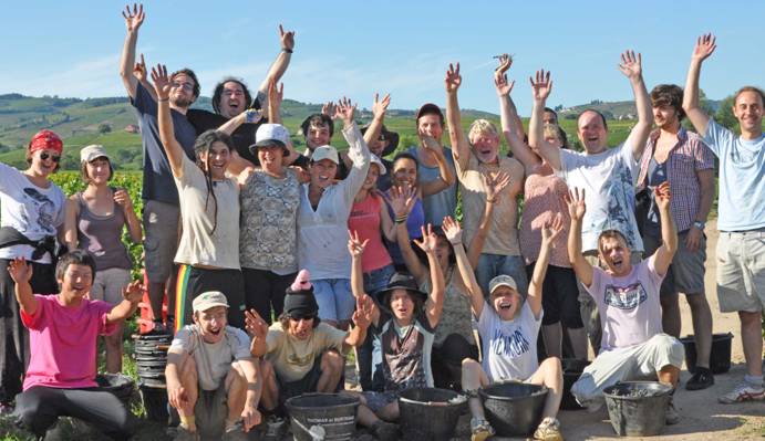 自然派の元祖・ボジョレーのラピエール家が2013年の収穫を開始! 今年も世界中から若者が集まって来ました。9月26日に開始した収穫。ほぼ30度近い真夏日の快晴の天気だった。 約半分の収穫人は毎年参加のベテラン・メンバー。色々心配された13年もやっと収穫にたどり着きました。 このエネルギーの塊が自然派ワインの中心だ! このエネルギーがラピエール家のワインの中に伝わっていく。 毎年来ているベテラン組が新人を教育しながら収穫が進んでいく。今年も収穫は葡萄の品質を見極める選別眼が必要だ。体力的に厳しい労働を励ましあいながらパワフルに進めていく。 3女のアンヌを中心にベテラン・メンバーも気勢を上げた。 これから2週間から3週間の厳しい肉体労働をする合宿メンバー仲間だ。 お互いに励まし合いながら、元気に、楽しく、確実にやってほしい。 収穫の総指揮官・マリー・ラピエール 今年もラピエール家のブドウ園での収穫指揮はお母さんのマリーが担当。それを3女のアンヌが補助している。約60人の収穫人を4グループに分けて収穫をしている。葡萄園の炎天下では30度を超す暑さ、昼食後の収穫はこの二人が気合を入れる。 2013年 初ジュースを聞くマチュ・ラピエール 醗酵槽に葡萄丸ごとを入れて下からジュースを抜き取って試飲する醸造担当のマチュ。マルセル・ラピエール亡きあとを見事に引き継ぎマルセルより美味しいワインを造る、と世界中から認められているマチュ・ラピエールだ。 2013年は収穫が例年より2~3週間も遅れている。4.5,6月の寒くて雨が多く、曇りがちな長い春が原因だ。開花時期が既に3週間も遅れた。しかも同じ畑でも一挙に開花することなく3週間に渡って徐々に開花していった。 同じ葡萄木の房でも開花が長期間に渡って行われたので葡萄の熟度が平均していない。収穫の決断が難しい年だ。マチュ・ラピエールは同じブドウ園を2回に渡って収穫することを決意した。葡萄の状態を見て臨機応変に対応が必要だ。 一回目の収穫では、a-良く熟している葡萄、b-あと2週間も耐えられそうにない葡萄を収穫して、2週間後の良く熟した頃にもう一度2回目の収穫にやってくる。b-の葡萄はVDPワインに回す。収穫人の選別眼が重要になる。 13年もラピエール家では厳格なトリアージ(選別作業)を実施 ラピエール家のトリアージ作業は間違いなくNO1の厳しさ。トリアージとは腐った葡萄や傷んだ葡萄を取り除くこと。また葡萄の悪い部分を取り除く作業のこと。葡萄全体がダメな場合は切り落す。一部の場合はその悪い部分を取り除く作業。下部を切り落とす。 ラピエール家はトリアージ作業のチャンピオンだ。繊細で上品で透明感があるワインは偶然にはできない。葡萄の一粒一粒を丹念に検品しながら悪い部分を切り落とす。こんな時間がかかる作業を徹底しているのがラピエール家だ。途轍もない手間暇のかかる作業だ。 今年も膨大な時間をトリアージに割いている 50人の収穫人全員が葡萄の一粒一粒を検品、切り落とし作業(トリアージ)を行っている。ここまで徹底しているのは、フランス中で見たことがない。 ロマネ・コンティより厳格なトリアージだ。 マチュ・ラピエールはお父さんのマルセルの教え『健全な葡萄のみを収穫』を更に徹底しただけ。 13年は比較的このような健全な葡萄が多い。昨年は腐った葡萄が多かった。収穫人にとっても、こんな美しい葡萄にハサミを入れる時の快感は格別だ。今年の特徴は葡萄木の生育が2,3週間遅くなり収穫も遅れた。しかし、最終的に品質上は良年といえる。 今年もミルランダージが多い 13年の特徴はミルランダージ化した葡萄が多いこと。ミルランダージとは開花時の天候不良の為、1房の中でも開花が同時に行われなく、結果として大きい粒と小さな粒が混じった葡萄房が形成されること。果皮の面積に比較して果汁が少ないので濃縮したワインができる。結果的に品質的には良年となる。 収穫時の3人の大切な役割 1-運び屋 2-トリアージ専門屋 3-ムードメーカー屋 収穫時には、葡萄を採る人とポルトゥール(運び屋)がいる。ポルトゥールとは収穫人が採った葡萄を籠に入れる。その籠を葡萄園の端に準備してある箱まで運ぶ人のこと。運びながら葡萄の品質をチェックする。悪い葡萄が籠に入っている場合は収穫人に選別作業のやり方・基準を教え込む。大切な仕事だ。 だからベテランが担当する。かなりの重労働である。1日に運ぶ重量と歩く距離は半端ではない。屈強な体力も必要だ。 ポルトゥールが運んできた葡萄を更に再度、葡萄の品質を検品して悪い葡萄粒などを取り除く作業(トリヤージ)をする人がいる。この部分はベテランの人がやる大切な仕事。彼女はオランダ人でもう13年前から毎年収穫にやってくるベテランだ。 項目ラピエール家 3女のアンヌ 一日の終盤になると、体力的に疲れて精神的にも参ってくる。誰かが歌を歌ったり。ジョーダンを飛ばして、気分を抑揚させる必要がある。ムードメーカーが必要