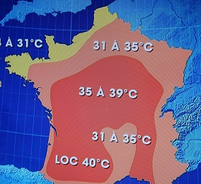 8月6日の予想気温 天気予報で世界中で気温が上がっている状況を説明していました。 北アフリカのアルジェリアでは、最高気温51度を記録。アメリカ・カルフォルニアで48度、 ノルウェーで33度、北極でも30度! そして、日本が41度を記録したことも話していました。 フランスで39度が最高。明日局部的に40度になっても不思議でないとの予報。 病院に運び込まれる人が続出。 南フランスでは山火事が発生。 幸いにも水曜日にはやや落ち着いて来そうな感じ。 ここまで続くと流石に葡萄にも影響が。 後3週間で収穫となるけど、それまでの気候が超大切。 雷、雹だけは避けたい。 祈るのみ!    Quelle chaleur!! Le monde entier souffre de la canicule!! Prévision du 6 août 2018 Le météo montre une grande augmentation d’une température dans le monde entier. En Algérie, le mercure monte à 51 ℃, en Calfornie à 48, en Norvège à 33, même au Pôle nord à 30 !!! Et au Japon à 41. En France la température la plus élevée est de 39 et localement atteint 40. Le nombre des victimes transportés à l’hôpital doit augmenter. Dans le Sud, les incendies se produisent sans cesse. Après demain, ça devrait se calmer. Si ça continue, les vignes seraient […]