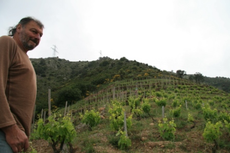 数年前に初めてここル・カゾ・デ・マイヨルのワインを飲んだことが、自然派ワインの世界に身をおきたいと思うようになったきっかけだった。自然派ワインの経験値が低かった当時の私にとって、ジズレヌとアランの二人が作り出すワイン(記憶では、当時初めて飲んだ一本はSoula V)の力強さ、いくつものスパイスが混ざり合ったような複雑さ、はこれまで経験したことの無い衝撃的なもので、自分の舌と記憶に深く刻み込まれることとなった。このワインに出会った当時は、自然派どころかワインとはまったく無縁の業界に身を置いており、Soula Vに関しても当時から通い詰めているパリの自然派ワインブティックCrus et Découvertesのオーナーであるミカエルに勧められるがまま購入した一本だった。ところが、結果的にはまさにこのSoula Vこそが私の人生の方向性を大きく変更し、決定付けた一本だったと言える。それ以来、パリにいながらも時折、試飲会などでル・カゾ・デ・マイヨルのワインを口にする機会(訪問の一週間前にもカーヴ オジェでの試飲会にジズレヌがいらっしゃっていて、2010年の各キュヴェを試飲させていただいたところだった)には恵まれていたものの、いつかこの土地を訪れて、彼らのワインをより直接的に、よりよく理解したいと思うようになった。 そして、この度ついにその機会に恵まれたのだ。 お客様のラングドックおよびルシヨン地方巡りに同行した折に、途中から一行と離れてひとりバニュルス・シュル・メールの街に残った。その日は、楽しみでなかなか眠ることができず、翌朝のアランとの待ち合わせに備えて、待ち合わせ場所である醸造所の下見に行った。醸造所は、自然派ワインバーや酢のショップが並ぶ街の中に位置していた。 待ち合わせ時間の10時を少し過ぎて到着しても醸造所の扉は固く閉じたままだったが、写真撮影などしていると、ほどなくしてアランが登場した。ジズレヌにはパリの試飲会などでお目にかかる機会がこれまでにもあったが、アランとは初めてお会いすることができた。赤黒い鼻と、握手した時に感じたゴツゴツした大きな手が印象的な優しそうな人だった。 挨拶もそこそこに、早速アランの車に乗せてもらって畑巡りを開始。ル・カゾ・デ・マイヨルの畑は、海に近いバニュルス・シュル・メール (1ha60)と内陸のTrouillasトゥルイヤ (2ha、バニュルス・シュル・メールから40kmほど離れた平地に位置し、土壌は粘土砂質)に区分され、それぞれ地質も環境も全く異なる。今回は、アランに海に近いバニュルス・シュル・メール のいくつかの区画(主に古樹が植えられており、土壌はシストで乾燥質。このバニュルス・シュル・メールの畑からは現在、赤のキュヴェが3種類、白のキュヴェが1種類作られている。古樹は、同じ区画に複数の品種を植えている)をご案内いただいた。そして、さらに、バニュルス・シュル・メールの畑は、大きく分けて海沿いの区画と内陸の区画とに分かれており、以下、「海沿いの区画」と「内陸の区画」それぞれの特徴を記す。 地中海を見下ろす絶景のブドウ畑 海沿いの区画 Banyuls-sur-Merの畑のうちでとりわけ特徴的なのは海側の区画で、地中海を一望できる標高200メートルほどの高台の急な斜面に広がっている。畑の周囲はgarrigue(ガリッグ: 野生のハーブ等の低木草)が生い茂る環境で、歩いているだけで強いガリッグの香りが鼻腔をくすぐる。また、この区画のもうひとつの大きな特長は、陸側からの強風(tramontane : トラモンターナ)および海風にさらされていることである。これらの風がガリッグの強い香りをブドウ樹に吹き付け、ブドウに風味を与えるとのことである。また、何も遮るもののない日当たりのよいこの区画が2003年の猛暑に耐えることができたのは、海の近さと海風のおかげだということである。 内陸の区画 海からは少し離れた内陸の区画の特徴は、標高100メートルから350メートルまで様々な場所に区画が点在している(例えば、ゴディという区画は標高250メートルに位置し、古樹のなかでも樹齢の高い樹が植えられている。他には、標高300メートルに位置するグラタイユルや周囲の森によって淡水が確保されているためバニュルス・シュル・メールの畑のうちで最も水分に富み、涼しい区画であるシャタニエなどがある)ことである。海沿いの区画に比べて、土壌の乾燥度が低いため、岩盤が詰まって層を成しているシスト土壌を見ることができる。 「ワインは周りの環境全てによってできあがる!」 以上のように、今回はアランと共に3時間半かけてバニュルス・シュル・メールの畑を構成する海沿い、内陸の複数の区画を歩いた。ここのワインに感動を覚えて以来、初めて自分の目で土地、環境、生産者を自分の目で直接見ることができ、ここのワインをより多角的に理解できた気がする。アランと色々な話をする中で、印象的だった言葉をひとつ取り上げるとすれば「ワインは土壌だけでなく、周りの環境すべてで作ら