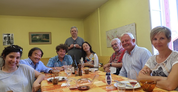 蔵の2階に食堂がある。蔵で働いている収穫人や社員達が食べる食堂がある。 今日はフィリップ・パカレを昔から応援しているミッシェルさんとその友達と一緒にやって来た。 ミッシェルも毎年この収穫時期にここにやって来る。(ミッシェルは右から3人目) 私も収穫期は飛び周っている。直ぐ退散する予定だったけど、フィリップがニコニコしながら美味しそうなソーセージを引っ提げてやって来た。皆で楽しんだ。 お蔭で短い時間だったけど、ホッとした楽しいひと時を過ごせた。