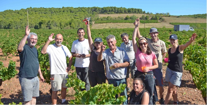 15年は史上最高に美味しい微発泡酒、PET ‘NATができるだろう!! 毎年、フランスで最も早く収穫を開始するのが、ここジョリー・フェリオル醸造である。8月中旬に収穫を開始。世界中から取り合いの超人気ワイン、ジョリー・フェリオルの微発泡酒、PET ‘NAT用のムスカ品種を収穫。 キリっとした酸を残す為に、完熟の手前で収穫する。 今年はフランス中で大騒ぎの40度に達する高温だった。しかし、ここルシオン地方は毎年の猛暑で、ここの葡萄木達なもう慣れている。 2015年の猛暑はここでは、別に驚くことでもない。 昨年の方が1週間早く収穫を開始したほどである。 シスト土壌で育つムスカは、キリっと締まった酸を残してくれる。 シスト土壌独特の冷たいミネラル感がこの微発泡酒の人気の理由だ。 何て美味しいんだろう! 今年は、晴天日が多く乾燥度が強かったのと、タラモンターヌと呼ばれる風も強くて、更に乾燥度が激しかった。 お蔭で、病気の発生が皆無だった。腐った葡萄が一粒もない健全な葡萄を収穫完了した。しかも、強風のお蔭で酸まで濃縮して発泡酒のペット ‘ナットには最高の条件が備わっての収穫だった。 史上最高に美味しいスカットしたPET ‘NATになる! 二人の愛情と夢と喜びを泡に閉じ込めたPET ‘NAT ペット ‘ナット イザベルとジャンリュックは2005年に パリから移住してきた。イザベルの家族の故郷でもあった。 イザベルはダンスとヨガの先生をやっていた。 ジャンリュックは情報処理管理の会社を経営していた。 コンピューターのエンジニア出身。 好きな事を見つけるとトコトン突き進んでいく二人。完全な自然、完全手作りの 発泡ワインを造りあげた。 スペインの国境に近いルシオン地方にまるでマカロニ・ウエスタン西部劇に出てきそうな風景の街 Espira de l’Agly エスピラ・ド・ラグリ という村がある。そこに、数百年前にはナポレオン3世やイギリス王室に納めていたほど有名なドメーヌが、ほぼ廃墟化していた。好奇心旺盛な二人は、ここを再生させることに後半の人生を賭けることに決めた。畑、土壌を調査すると途轍もない可能性を秘めた銘醸の土壌であることを発見。シスト土壌と石灰土壌の境に位置して畑によってはその二つが入り混じっている特殊な土壌をそなえていた。 口にした誰もが »笑顔 »になるワイン 自分達のこの夢、喜びを表現できるワインを造りたかった。ドメーヌの横にシスト土壌に果実味の豊かなムスカ品種が植えられていた。誰もがホッとする果実味だった。これで発泡ワインを造って、その泡の中に自分達の夢とかこの喜びを閉じ込められたら・・想像しただけでもワクワクしてきた。勿論、栽培は最初からビオ栽培。醸造もジュル・ショヴェ、マルセル・ラピエール系の自然派醸造を継承。 ジャンリュックはこの地に来た時、ペルピニャンのワイン学校に通った。その時の同級生が、あのYOYOさん、ドメーヌ・ポッシブルのロイックなど自然派の醸造家の卵が多数いた。そして、ジャンフランソワ・ニックに出会、自然派の造りを学んだ。 栽培、醸造、ビン内二次発酵、デゴルジュマン、便詰めすべて手作りを実現。 ここまでの手作業、愛情を込めたワインは存在しない。貴重な一本!! 友人や近所の知り合いが集まって収穫、ほぼ毎年同じ人や醸造家に成りたい人達がやって来る。収穫した葡萄は傷つかないように底の浅い籠に入れて丁寧に醸造所に運ぶ。葡萄の温度が高いまま発酵槽に入れると雑菌が繁殖するので、一晩クーラー室に入れて冷やす。 翌日に、そのままプレス機にかけてジュースを絞る。 ビン内二次発酵の時、糖や酵母菌を入れない本当に自然なアンセストラルの発泡ワインを実現。 ジュースをタンクに入れてゆっくり発酵する。 ここからがジャンルックの計算が始まる。 まず最初のジュースの糖度を図り、毎日の発酵の進み具合、糖度をチェック。 残糖が18gになった時に、タンクからビン内に詰めてビン内二次発酵をして、その発酵で生じた泡を閉じ込める。この糖度の具合が超大切なのである。すべて手作業でやる。 すべての人が笑顔になるワインを丹精に造りげた! ビン内発酵、デゴルジュマン、注ぎ足し作業、キャップシール付け、すべてが 手作業という贅沢な造り、本当に、ここまでの手作りは存在しない。 まさに、採算など考えず、愛情、夢、喜びを、すべての泡に閉じ込めた一本。 今、世界中からこの貴重なワインの引き合いが殺到している。 幸いにも日本への出荷量が一番多い