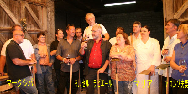 5月はフランスもゴ−ルデン・ウィ−クがある。 5月8日から12日まで休みの会社が多い。 その最終日12日にプリュ−レ・ロックにて2年に一度の飲んべ騎士団RINCE GUERLUTの認定式が行われた。 〜RINCE GUERLUTとは?〜 当主のアンリ−・フレデリック・ロックがお客さん、従業員、その他日頃世話になっている人達を集めて行う感謝祭のような式典である。格式ばったことの大嫌いなアンリはジ−パン・Tシャツ姿でわいわい楽しく飲んで食べて楽しもう、という会である。毎回5名ほどRINCE GUERLUTに認定される。 ゲルルとはブルゴーニュの方言で“良く飲み!よく食べる人!”を意味する。 アンリ−・フレデリックらしい命名で意訳すれば“飲んべ騎士団”がピッタリだ。 これに認定されると“鍬・クワ”(畑を耕すクワ)をプレゼントされるセレモニ−がある。