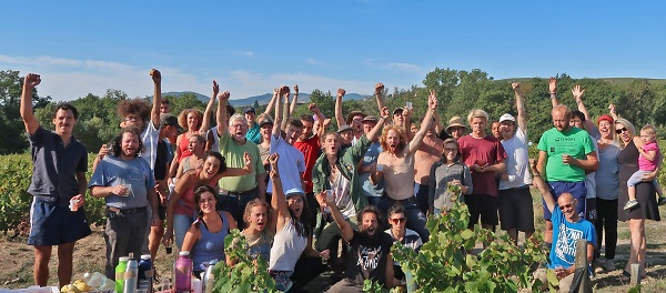 ワイン造りで、収穫は最も大切な行事の一つ! 一年間、ずっと母なる大地で、父なる宇宙の光を浴びて育った葡萄がある。 その葡萄達が、その生まれ育った故郷からお別れする日なのである。 そう、私達、人間に喜びを、勇気を、元気を与えてくれるワインに姿を変える為に。 出来れば、元気に、楽しく、丁寧にやって欲しい。 葡萄達も喜んで故郷の大地を離れることができる。 このサンシビリテー、大切な感性をマルセルは大切にしていた。 マチュとカミーユ・ラピエールはこの最も大切な感性を大切に守っている。 収穫時の朝の一休みの時は、葡萄園で収穫の人達と皆で朝食を食べる。 蔵で働く人達も集まってくる。忙しい中でも、ここで皆の元気な顔をお互いに確認しあう。 葡萄達も一年間、世話をしてくれた人達の笑顔をみて安心する。 この感性は最も大切なことの一つ。
