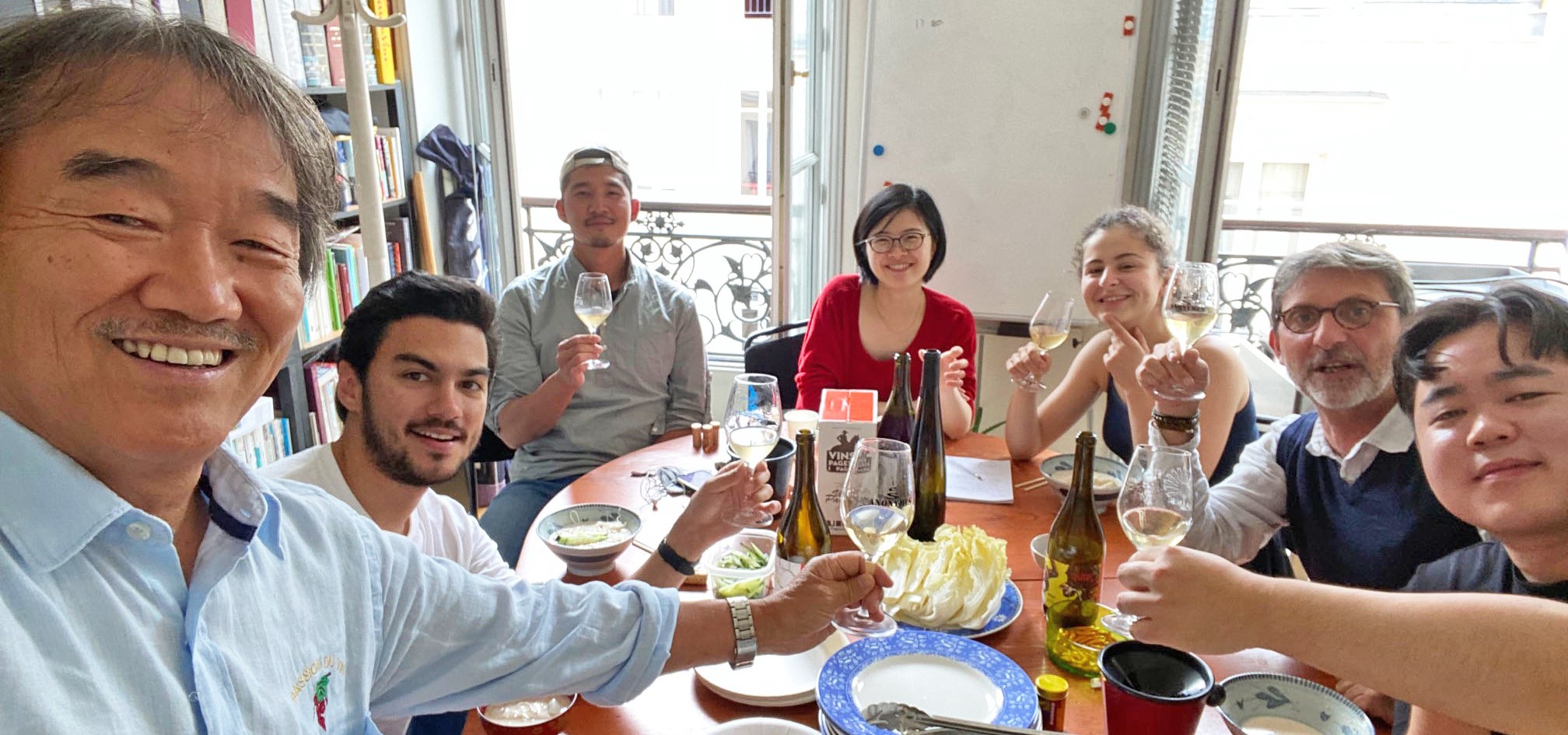 今日は、ミッシュラン三ツ星レストランで働いているソムリエールのクララさんも参加。 久々に逢った本当にワインを深く愛している人、クララさん。ここまでPassionを持っている人は少ない。 そして、もう一人のワイン好き。あの自然派ワインが充実しているClown Barクラウンバーで料理を担当している韓国人のジュノさん。今日はそのジュノさんが料理を担当してくれている。 今日のはじまりは、若き天才肌の醸造家セバスティアン・シャティオンの2020年産の試飲だった。 でもこんな熱く素敵なメンバーが集まったら飲み会になってしまうのは当たり前。 セバスチャンはParisの人気自然ワイン・ビストロ・Chateaubriandシャブリアンのシェフ・ソムリエだった。 その卓越した試飲能力で、最高に美味しい自然派ワインを選別してワイン品揃えをしていた。 セバスチャンが勧めるワインにお客さんは皆が感動していた。 だから店はいつも満員だった。 数年前に、そんなセバスチャンがワイン造りを目指した。 セバスチャンはソムリエになる前はミュージシャンだった。 特別な音楽的感性と卓越した試飲能力をもってワイン造りをしている。 彼はまるで作曲するようにワインを造っている。 つまり、その年に収穫した葡萄を観て、即座に目指すワインのスタイルを想像して、今までに存在しなかった赤葡萄と白葡萄を混醸したり、一部をプレスしてジュースのみを発酵槽に入れたり、また一部を除梗して、一部を除梗なしにしたり、通常の常識的ワイン造りとはかけ離れたアーティスティックなワイン造りをしている。 つまり毎年、一曲一曲違ように同じワインは存在しない。 まるで作曲家のようなワイン造りをしている。 2020年、一段とレベルアップしたワイン達が完成した。 ☆RIOT リオ  ゲヴェルツトラミネール品種を4日間のみのマセラッション。一部は直プレスのジュースのみ。           絶妙の心地よい上品なアメルチューム。 ☆Petit Agite プティ・アジテ  白葡萄のマルサン品種、と今、人気品種のサンソー品種を混醸して短いマセラッションで                アルコール度数 たったの11度のグイグイ体に入っていく優れもの。 ☆Les Amants Maudits レ・ザマン・モーディ  グルナッシュ・ノワール品種の除梗なし、白葡萄のユニ・ブランを直プレスして、5日間」のマセラッション(カモシ)、ゲヴェルツトラミネールのオリを入れた特別な風味。 すべてが特別な造り、こんな自由奔放な組み合わせのワイン造りをやるのはセバスチャン・シャティオンだけだ。 どれもオリジナルでバランスが良い。世界中で取り合いになるだろう!アッと云う間にストックがなくなるに違いない。 さて試飲会のあとは、ジュノさんの料理と美味しいワインの共演だ。 いやー、自然でバランスが佳い美味しいワインはドンドン体に入ってしまう。よく飲みました。